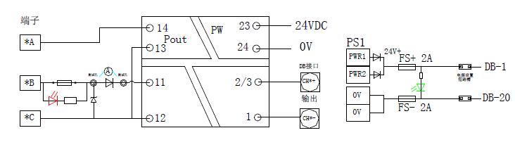 電源設置: DB 口含有2 芯電源線,用于向PLC 模塊供電。這些電源由電源輸出設置的短路帽進行控制,每個短路帽對應一根線,詳見右圖,送電前應根據需要進行設置。電源指示在保險下方,電源接反或保險燒斷時電源燈不亮。例:如果本端子板配1KF02 模塊,該模塊無需供電,則對應該模塊的2 個短路帽均拔下;